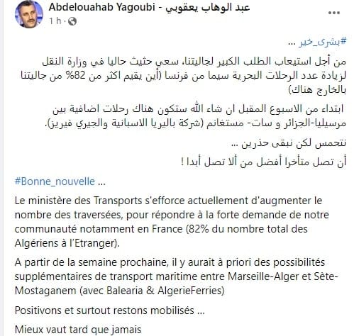 Les critiques de la diaspora semblent avoir été entendues par les hautes autorités du pays après un début d’été difficile. C’est le député des Algériens de France, Abdelouahab Yagoubi, qui vient de publier sur sa page Facebook, ce qu’il a qualifié “d’une bonne nouvelle”.