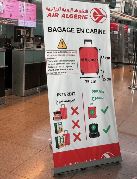 Si la règle concernant les bagages en soute est souvent respectée, celle des bagages cabine a eu dernièrement besoin d’un durcissement de la part d’Air Algérie qui a instauré une taxe pour tout bagage à main supplémentaire ou non conforme au règlement.
