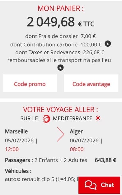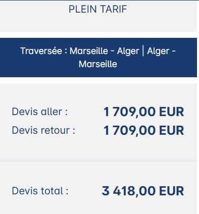 Avec la compagnie nationale, Algérie Ferries, pour un aller-retour Marseille – Alger (6 – 28 juillet), avec la même configuration, le prix est nettement plus cher que ses concurrentes. Il est en effet affiché à hauteur de 3.418 euros.