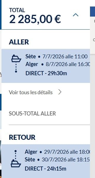 À titre d’exemple, un aller-retour Sète – Alger (7 – 29 juillet) pour une famille de quatre membres (deux adultes et deux enfants), avec une cabine et une voiture de tourisme, est affiché au prix de 2.285 euros.