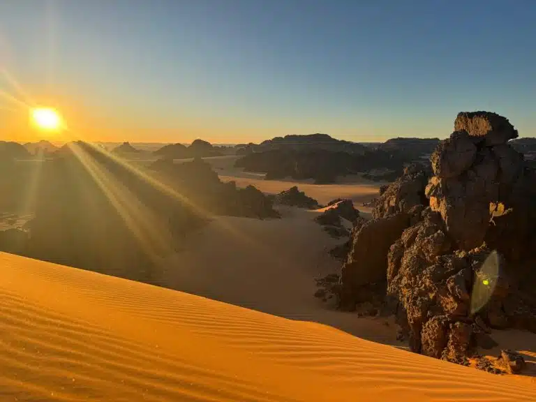 Porte du parc national du Tassili n’Ajjer, classé au patrimoine mondial de l’UNESCO, Djanet est célèbre particulièrement pour la Tadrart Rouge, les gravures rupestres, l’oasis de la vieille ville et les bivouacs sous les étoiles.