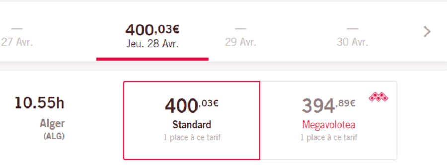 C’est le cas pour le vol Volotea Bordeaux – Alger du jeudi 28 avril, proposé actuellement à 400 € en aller simple bien sûr.
